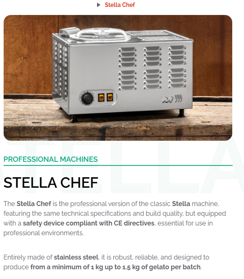Stella Chef là phiên bản chuyên nghiệp của máy Stella cổ điển, có cùng thông số kỹ thuật và chất lượng chế tạo, nhưng được trang bị thiết bị an toàn tuân thủ chỉ thị CE, thiết yếu để sử dụng trong môi trường chuyên nghiệp.