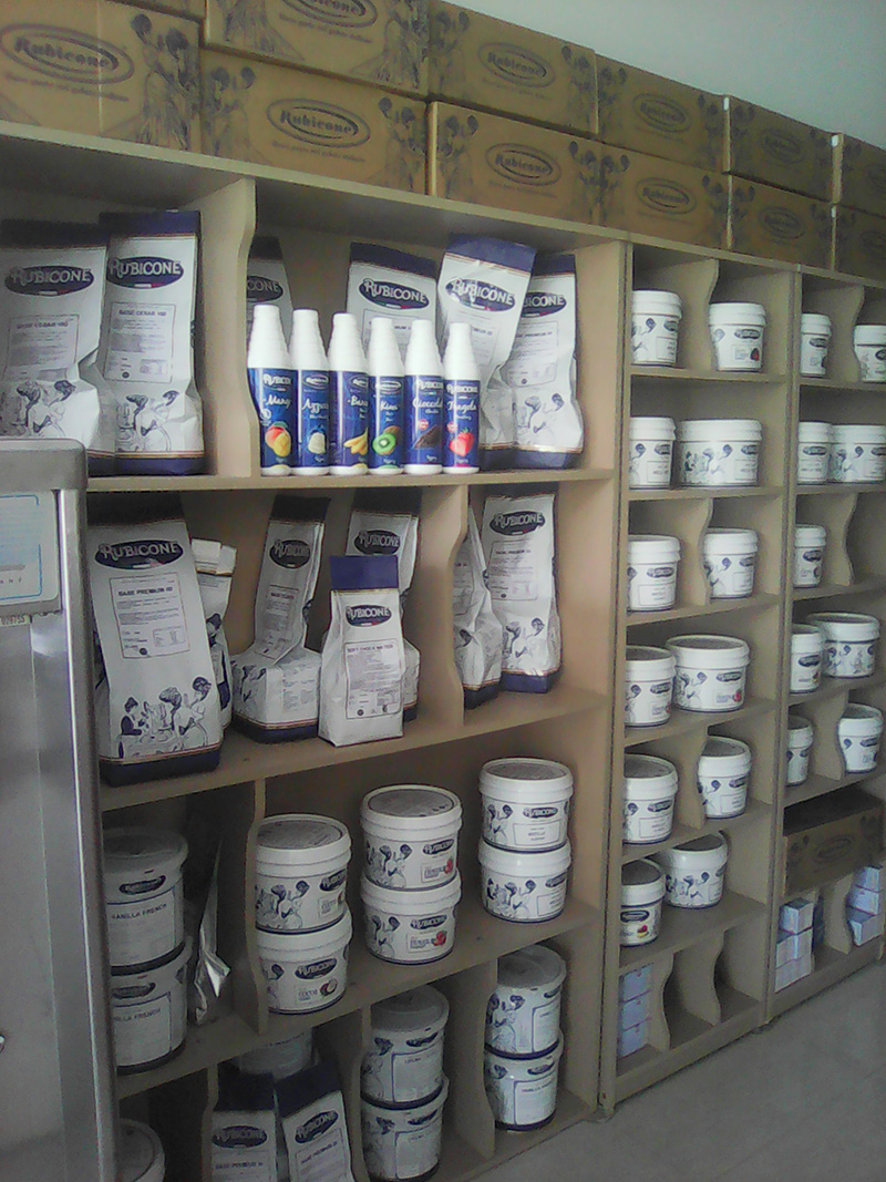 Từ năm 1959, hãng Rubicone đã sản xuất các nguyên liệu làm kem cứng, kem que, bánh ngọt, rồi đến kem yogurt nhằm đáp ứng nhu cầu sản xuất của người tiêu dùng trong nước và trên thế giới. Đến nay Rubicone đã tạo ra rất nhiều loại bột kem nền cho kem gelato, kem soft serve, stick... và có trường đào tạo kem cứng, kem tươi tại Ý.