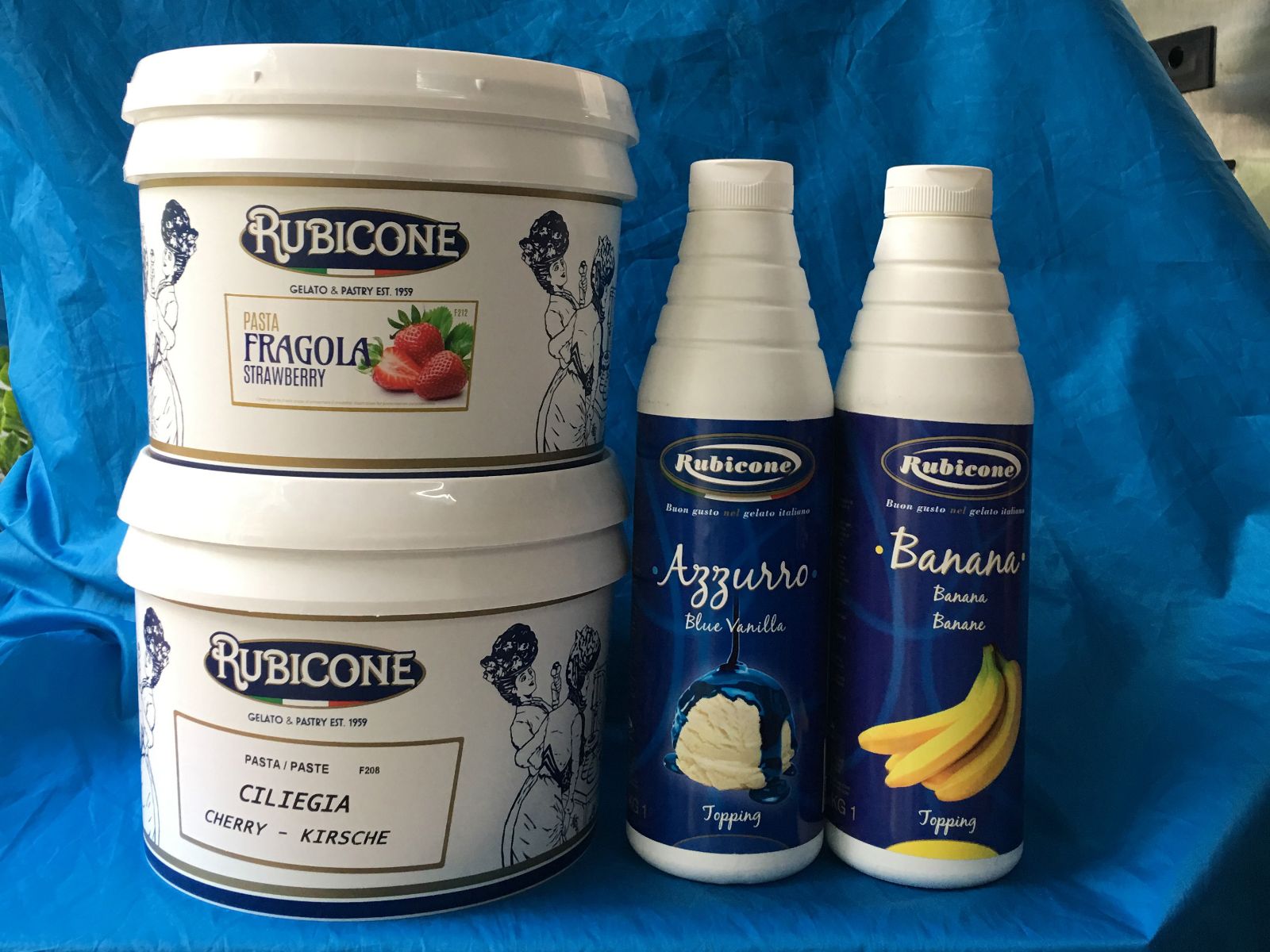 Từ năm 1959, hãng Rubicone đã sản xuất các nguyên liệu làm kem cứng, kem que, bánh ngọt, rồi đến kem yogurt nhằm đáp ứng nhu cầu sản xuất của người tiêu dùng trong nước và trên thế giới. Đến nay Rubicone đã tạo ra rất nhiều loại bột kem nền cho kem gelato, kem soft serve, stick... và có trường đào tạo kem cứng, kem tươi tại Ý.